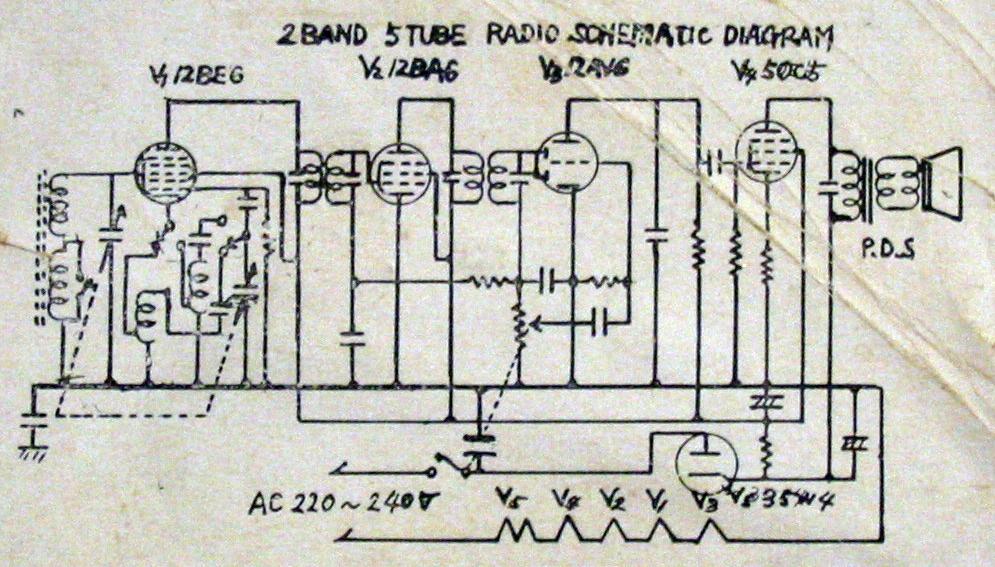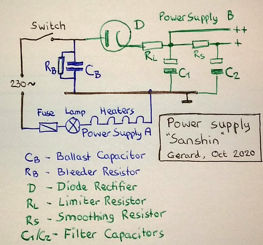 The blue lines give the A supply: the mains current runs through the heaters (and possibly dial lamps) and through the ballast capacitor CB. Observe that circuit ground is the connection between the heaters and CB! The green lines give the B supply; AC over CB is rectified to serve as B+. The AC over CB may be as high as 200V, but the resistance of the heaters serve as both ballast and limiter, and the voltage on C1 can be around 100 to 120V.