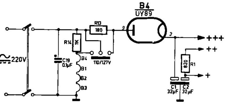The picture to the left shows the power supply of the Philips B0X19U. In 110V operation, R13 and R14 are shorted. To enable 220V operation, the power selector is released, placing R14 and R13 in series. The purpose of R14, referred to as a ballast resistor, is to reduce the current through the heaters. The purpose of R13, referred to as a limiter, is to limit current peaks through the rectifier.