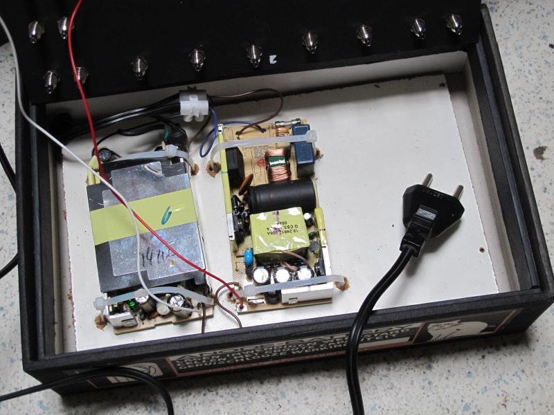 This is composed of two laptop power supplies, a Canon CA-CP200 (24V at 2.2A) and a Dell AD-4214N (14V at 3A).  With these two in series, the total supply gives about 39V and should be able to give more than te 2A I need.   On the Wikipedia page about the All American Five I read that a modification allows the radio's to operate  from 32V DC.  I experimented with a Dutch ACDC set, the so-called UUtje, and found it can play on 39V DC.  To this end, the heater circuit is rewired.  The rectifier UY85 is removed.  The UCH81 and UBF80 in series run perfectly on 39V.  The UCL82 also is heated from 39V, which is far subnominal because the normal heater voltage is 50V.  The rectifier is replaced by a diode, which gives a B+ voltage around 39V.  The radio is designed to run on 120 to 220V as B+, so it is quite surprising that it will play on 39V too.