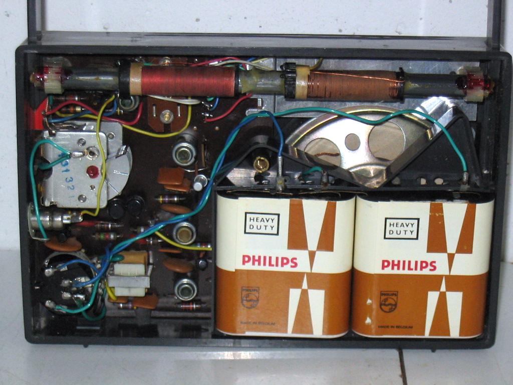 Inside picture, showing the (empty) Philips batteries that were inside when I got the radio. The battery compartment has only three contacts. The long stripe of one battery must be folded over to share the contact with the short strip of the other one.
