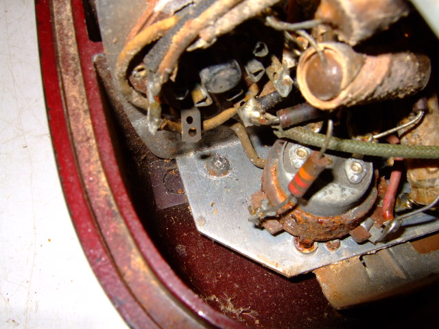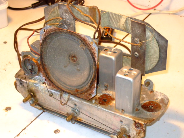 Where has this chassis been burried or drowned over the past 60 years?  There is a lot of corrosion and crumbled isolation.  From under (right) it does not look much better.  Actually, this is the top, because the chassis is mounted upside down in the cabinet.