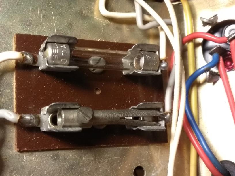 Looking inside I found a quite neat set, no rust or dust.  Of the two fuses, one was replaced by a metal plug leg and the other was blown; I replaced both by 25mm fuses, which fit the larger holder when placed inside a 25mm holder.  Also the plastic wheel driving the tuning capacitor was broken.  It functioned, but gave a little play in the tuning so later I applied some glue, without even having to take the wheel out.