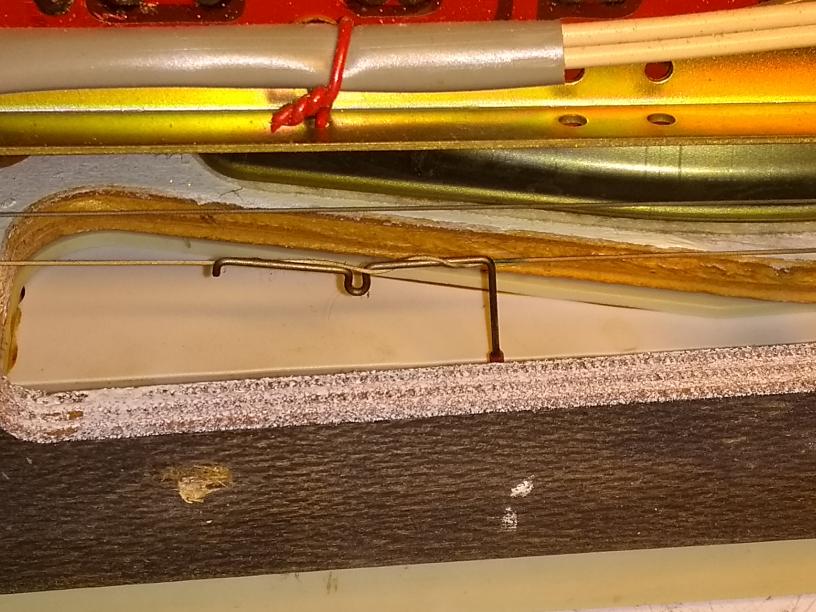Pulling the chassis can be a puzzle for Erres sets! For this radio: (1) Unscrew back (4 screws); (2) Unscrew (4 screws) and remove service panel on bottom; (3) Pull the four knobs; (4) Unsolder loudspeaker (brown wire above and black wire under); (5) Unsolder loop antenna (next to tuning cap); (6) Unscrew (3 different screw) and remove dial; (7) Through service panel, unhook dial pointer (photo); (8) Pull signal wheels from volume and tone pots (vilt rings in front of them); (9) Unscrew 3 bottom bolts of chassis; (10) Pull chassis.