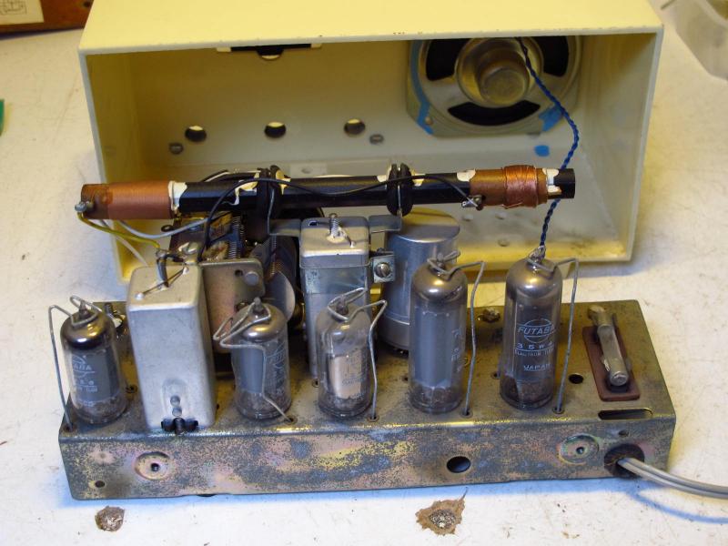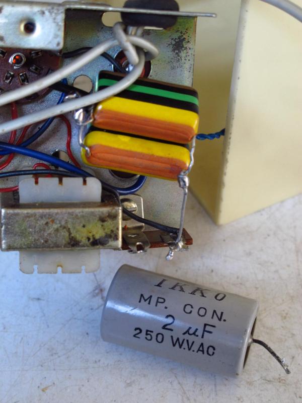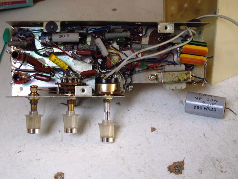 When I opened and measured the radio for the first time (after owning it for 13 years), I found out that the series capacitor had changed its value dramatically. From 2uF it had increased to 2.5uF, with considerable leak and it became hot after a few minutes. So I replaced it by two 1000nF caps in parallel (photo left). Having the set open, I also replaced three more capacitors and measured the voltages on all tubes, which appeared to be fine. With 105V/85V on the filter caps, the B+ looks a bit too low, but the radio plays very well so this is probably not a big deal.