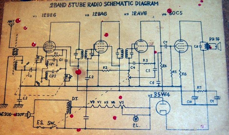 Several companies in Europa (and the US) imported these very cheap radio's from Japan, and also they could have them made by their own specifications. To adapt the radio, built for 115V AC in Japan, to the European 220V mains, different solutions were used. My radio has a series capacitor in the heater chain, as in this Schema, but some othe companies requested an auto transformer, like in this schema.