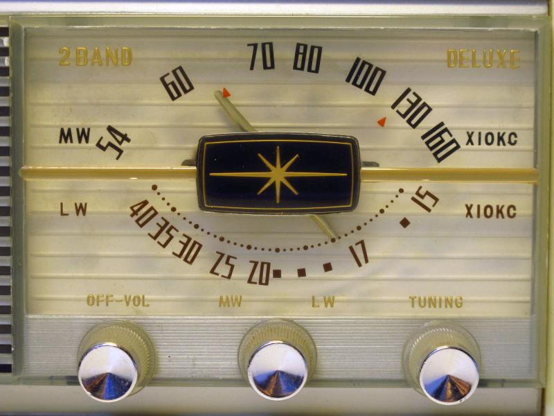 It has a very nice backpainted dial. At 640 and 1240 kHz you'll find Conelrad markings, which were obligatory in the US between 1953 and 1963, but placed on most export models by Japanese manufacturers. Station names are not common on radio's imported from Japan or the US.