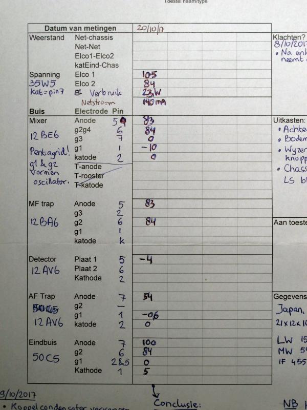 Two warnings to those who want to operate such a set: First, the dropper condensator is a paper cap, which can seriously wear out and damage the heaters of the tubes! Because of increased capacity or leakage, the heater current becomes too large. So replace this cap or at least check it! Second, the knobs come of quite easily after which you can touch the chassis. Normally this isn't directly connected to the line voltage, but in practice it almost is. The connecting capacitor of 50nF can pass lethal currents, it may be leaking to pass extra current, or some other component may have damaged insulation. Be sure to use this radio only with knobs and see that the chassis cannot be touched anywhere!