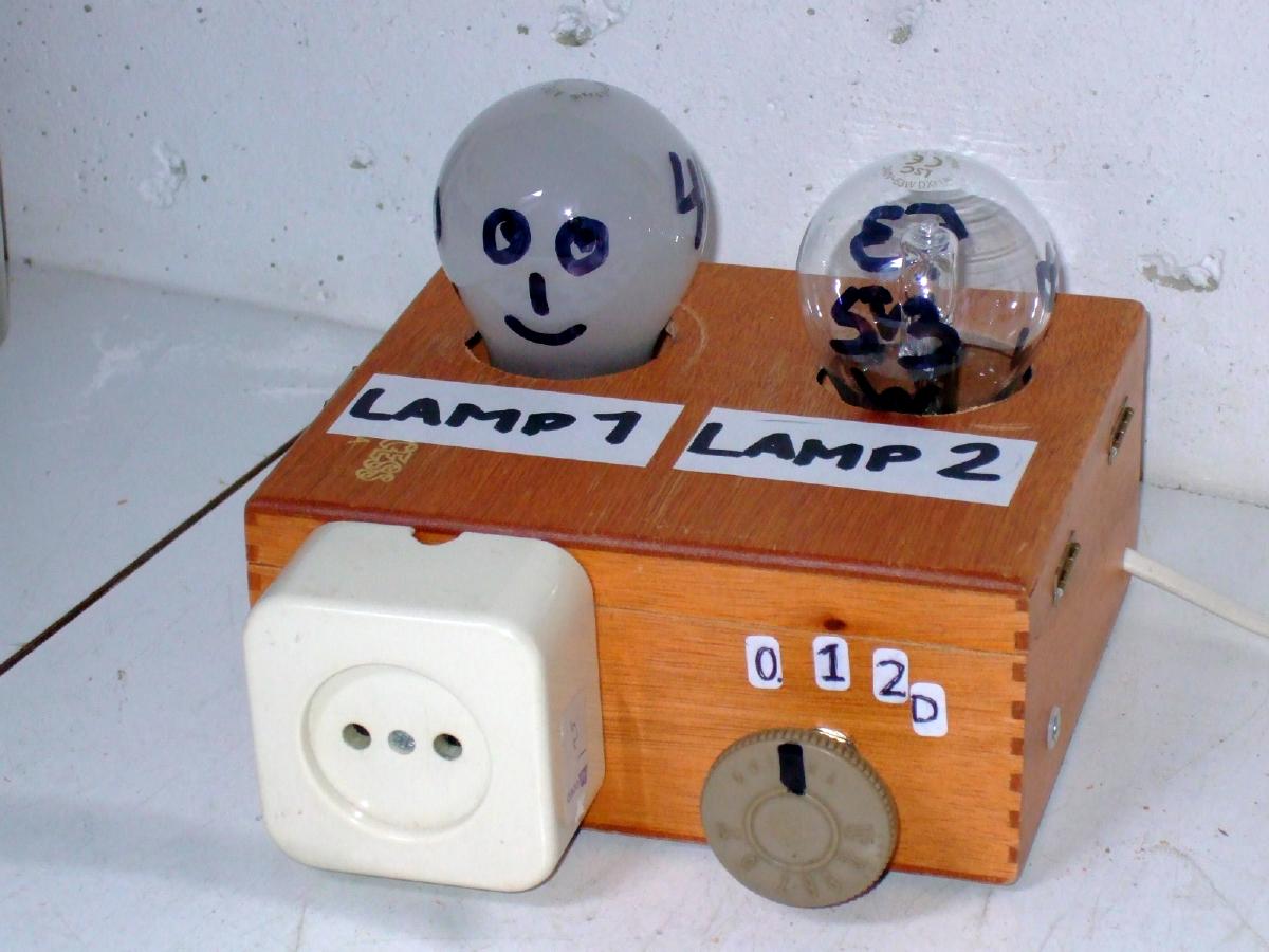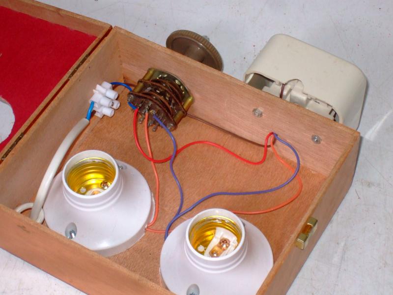 I restrained my self a little bit and restricted myself to a unit with two light bulbs. Together with Direct and Off (0), this requires four positions on the swith, but my switch had five positions. Assembly was not at all difficult. The mains lead has blue and brown wires, of which the brown goes directly to the socket. The blue goes to the switch. Lamp 1 has purple leads to the switch and the wall socket. Lamp 2 has orange leads.