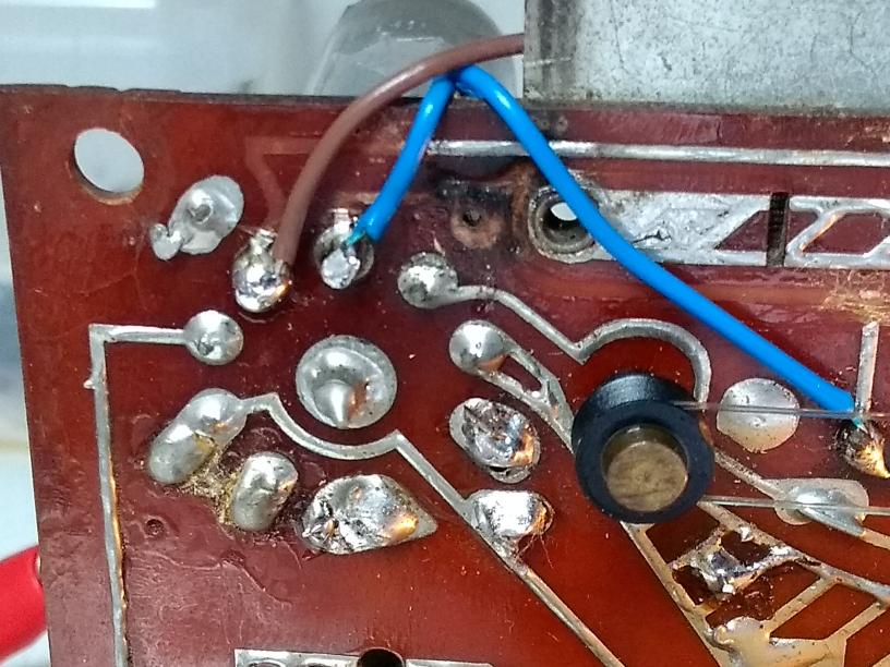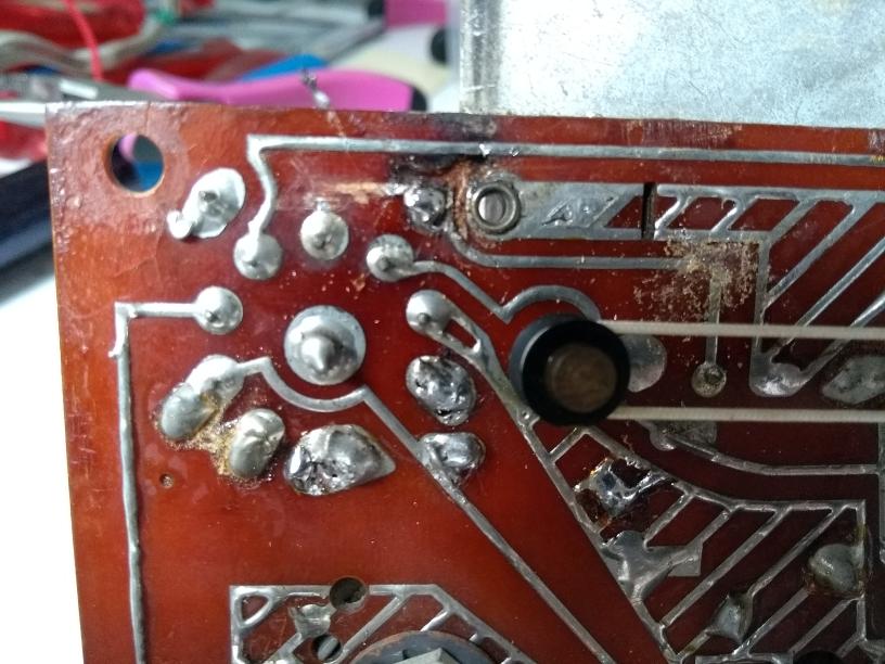 Extra wear on the tubes is a result, but the effect on the PVB is even worse. The PCB becomes black by carbonization and starts conducting current between the various tracks on the board. A previous repair has scratched out some of the conducting material, but this was not enough. In low light, I could see the sparks jump on the board. So I removed some of the trails completely and connected the components by wire. Also, the PCB has some interruptions, due to mechanical instability.