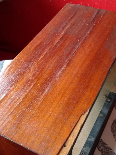 I learned that veneer damage can be repaired using a hot iron and damp cloth. You're supposed to iron your radio with the cloth in between, and this will bring back the wood in its original shape (also if there are bumps in it). Subsequently I applied some wood glue under the veneer. After the treatment, the wood didn't look like new, but a lot nicer already.