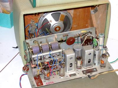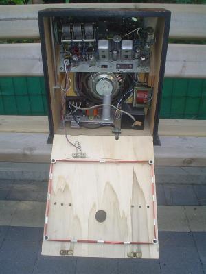 These little portables are sometimes a bit difficult to take apart, but this one is OK. Just pull out the antenna connector next to the HF tube, then unscrew two bolts on the chassis, and pull it backward. The loudspeaker remains inside the cabinet, and so does the output transformer. After a quite standard repair (replacing capacitors and rectifier) I got sound from the radio, but it was terribly distorted.