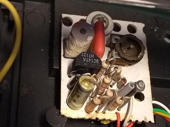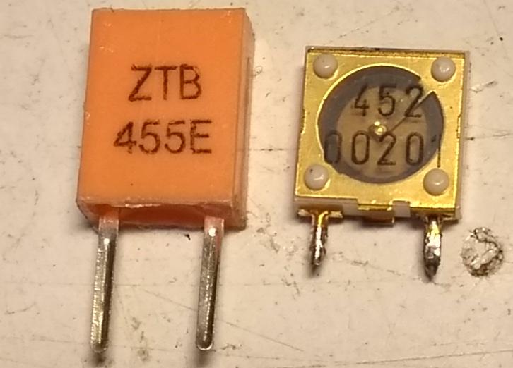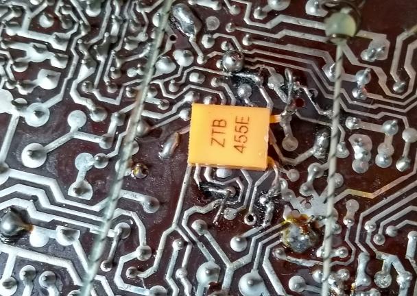 It does not happen often that you have to replace a fifty year old part and the new one is bigger; but here this was the case. Unfortunately, after replacing the resonator and building back the unit, the radio still didn't work well. In the end I decided to bridge the filter unit by a resonator under the PCB (right). But still this didn't work well. So we have a set that works very well on FM, poorly on SW, and not at all on MW/LW.