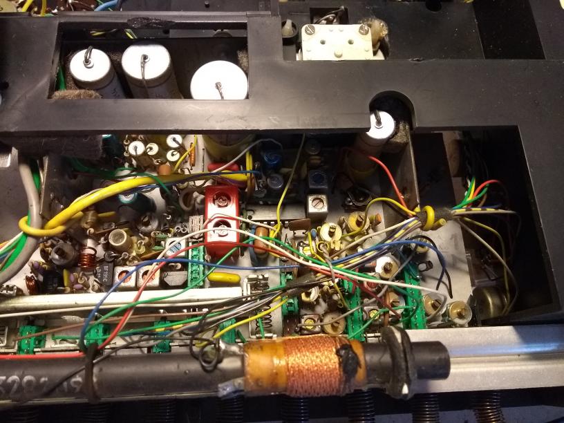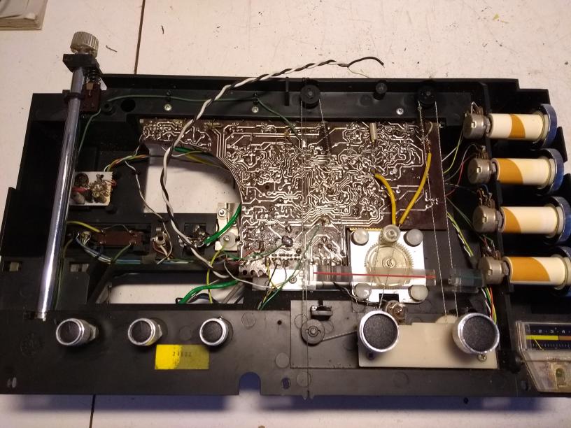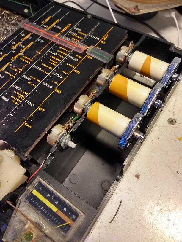FM worked fantastic all the time, but the AM bands were dead barring some scratching and I discovered this to be due to a shorted tuning cap. The isolating dielectricum is a dark mica like stuff that brittles. Fortunately, a fellow collector sent me a good cap and I succeeded to bring the AM bands alive with that capacitor. The model was produced with different type of tuning capacitor, where the ones with brownish isolation brittle, and the ones with white isolation are OK. MW and LW remained very unsensitive, unfortunately.