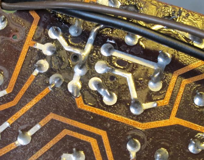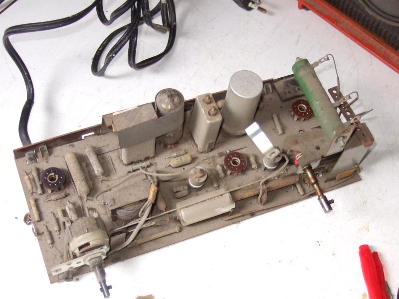 Pulling the chassis revealed a big dustpark, probably because of the missing back panel. I dusted out this mess and replaced four capacitors preventively: C11 (g2 decoupler for B1 and B2), C25 (plate of B3), C17 (coupling), and C19 (rattle). All tubes tested OK (in the 80 to 100% range). Then sound was not OK due to a loose contact in the volume pot, but this was quickly repaired. Pin voltages measured OK, so we had a healthy patient here. But noticeably of age. As you can see on the bottom photo, the PCB under the output tube is turning a little black. This indicates some burning of the paper material is taking place, and this can mean the end of the radio in the long term.