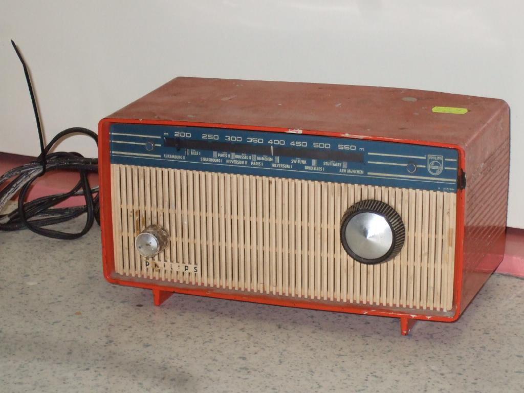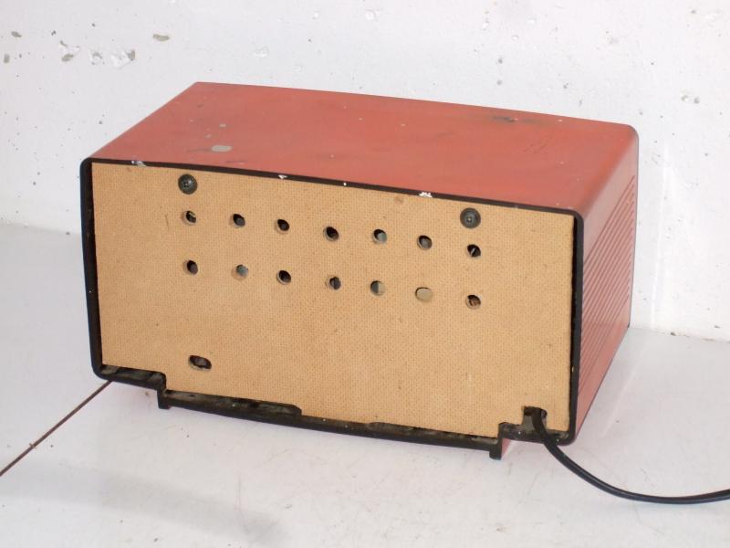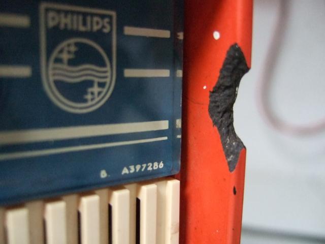 The second set, bottom on photo, is a little bit older (lower sequence number), but looks better than the first one, top on photo, which is dull and has paint spots, and misses the back panel. The first one had a dial coded B A379286, which is marked in meters of wavelength and has the names of 13 (mainly Dutch, Belgium, French, and German) stations. The second radio has a dial marked OV A396954, which is marked in meters and kilocycles, and has no station names. I think the B stands for Benelux and this dial was the standard in Belgium, Netherlands, and Luxembourg. The OV on the other dial could stand for OVerig, or other, or alternatively for OVerzee, or overseas. This dial could be standard for exported units. However, the radio was sold by Electronica De Boer in Zutphen, and I have no indication that the unit actually was purchased with emigration in mind.