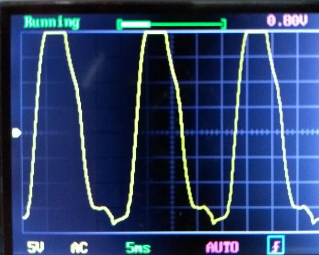 A next experiment was a modification to series power supply with capacitor. This resulted in a set consuming 16W from the mains, with about the same quality as the original (until you try to play it at max volume). On the left you see the disconnected (now superfluous) series resistor and the red series capacitor under it, and on the right the wave form of the current throught the heater. Observe that when the current is near its negative peak, the voltage on the rectifier is at its positive peak and it will start to draw current.