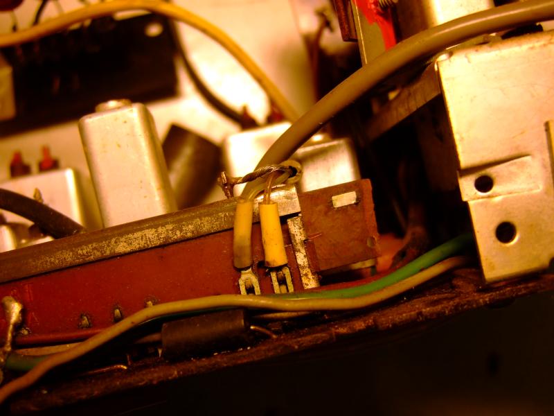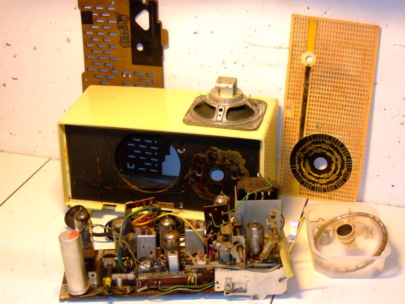 There are a few common problems with this type (and my set has them all). First, the plastic front parts (grill and knobs) tend to discolor badly. They also disappear and replacing the knobs with metal ones is very dangerous (picture) because the chassis is connected to mains! Second, the bandswitch breaks because of the fragile construction. Capacitors, tubes and resistors from the sixties often keep themselves remarkably well.