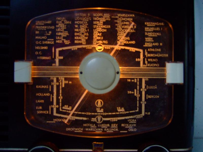 The radio has a nice dial that is built in front of the cabinet.  Philips is notorious for their weirdly complicated dial drive schemes.  In this radio, the dial pointer rotates over 180 degrees, fully in sync with the tuning capacitor.  Most manufacturers would drive the whole assembly with a single chord, running over the knob axis and the capacitor, and place the pointer on the same axis.  Not so Philips!  The knob drives the wheel on which the pointer is placed, using two pieces of wire.  Then, from this wheel to the condenator drive right behind it, there are again two wires, steel this time, running through bowden cables.  Fortunately, in this radio everything is reasonably well within reach.  Moreover the chord didn't need replacement.
