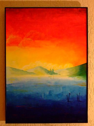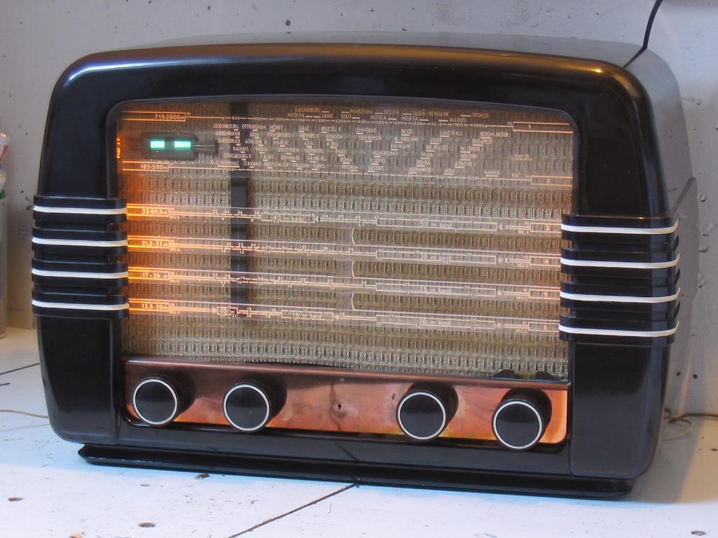 What I got after my effords was a radio that was not completely original, but fully operational, good sound quality, and very sensitive in all ranges including short wave. I exchanged it for an artwork, a painting as shown on the right. We painted the wall where it hangs with the same paint as used in the grooves of the radio.