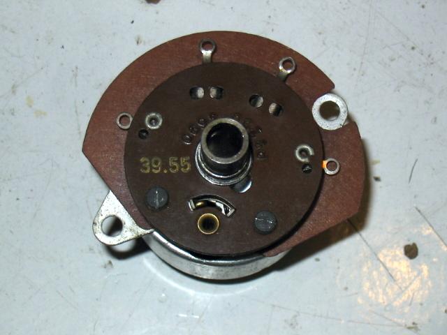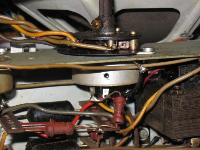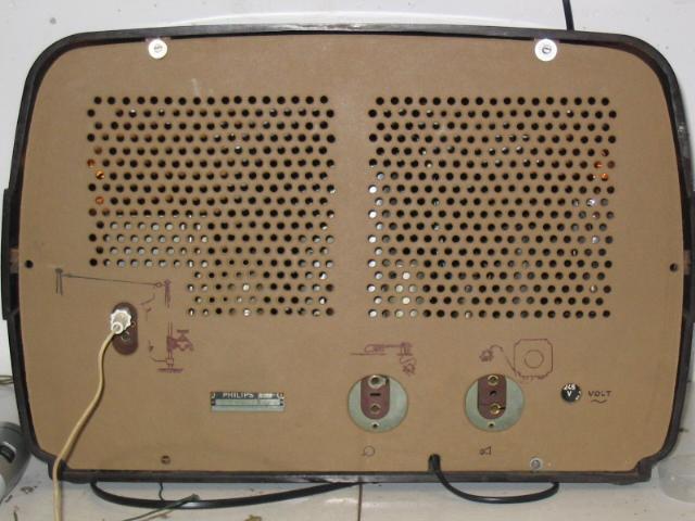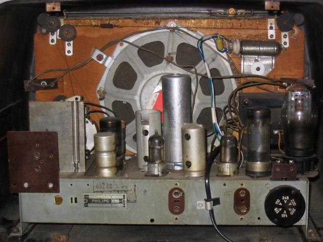What bothered me more was the cracking volume control. It could not be replaced by a modern component, because it has the mains wires in the front instead of on its back. And the space behind it was extremely narrow for moving with a soldering iron. A dug in my parts box produced a new, unused Philips potmeter of the necessary type; according to its date code (week plus year) it is exactly as old as a person very precious to me. With the expected difficulties I managed to implant the new part, working miracles to the sound quality and ease of volume control. (The sound fragment about Frits Philips was recorded before the replacement, and the radio sounds a lot better after.)