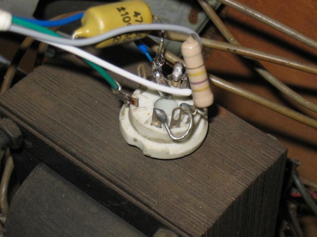 Somebody added a magic eye to the radio (left). Originally, the BX480A came without such a tuning help, but during the fifties one could buy add-on kits for radios. One simply had to mount the tube somewhere in the front, and connect it to the circuitry with four wires. It was not done very neatly (with wires much too long running all through the inside) and I replaced all four wires to the EM84. The wiring is: Blue is ground, connects to pins 3 and 4. Gray is heater voltage, runs to pin 5. Green is signal, runs to pin 1. White is plate voltage, runs to pin 6. (Further, a 470k resistor runs from pin 6 to 7, 7 and 9 are connected, and there is a capacitor between 1 and 3.)