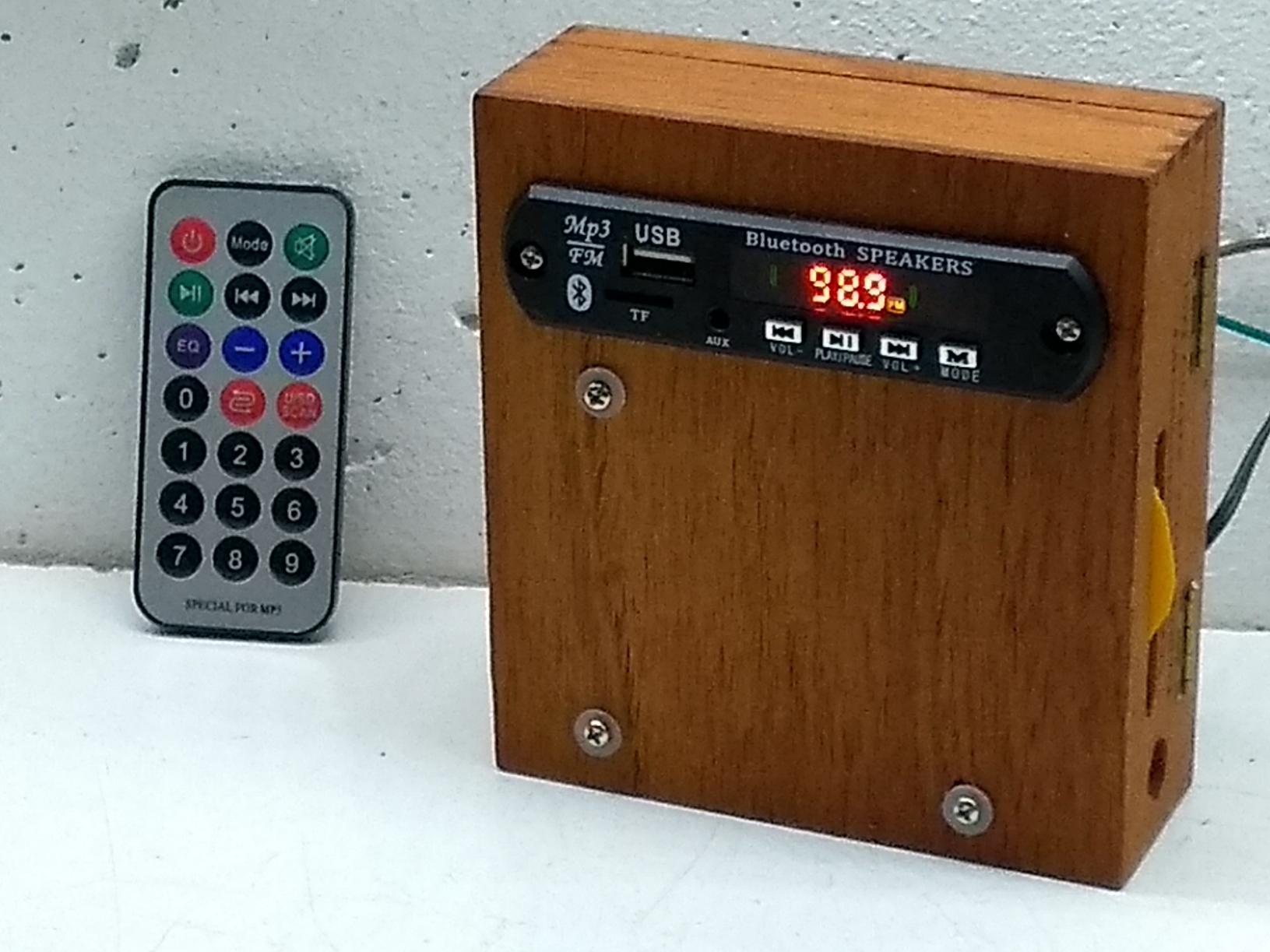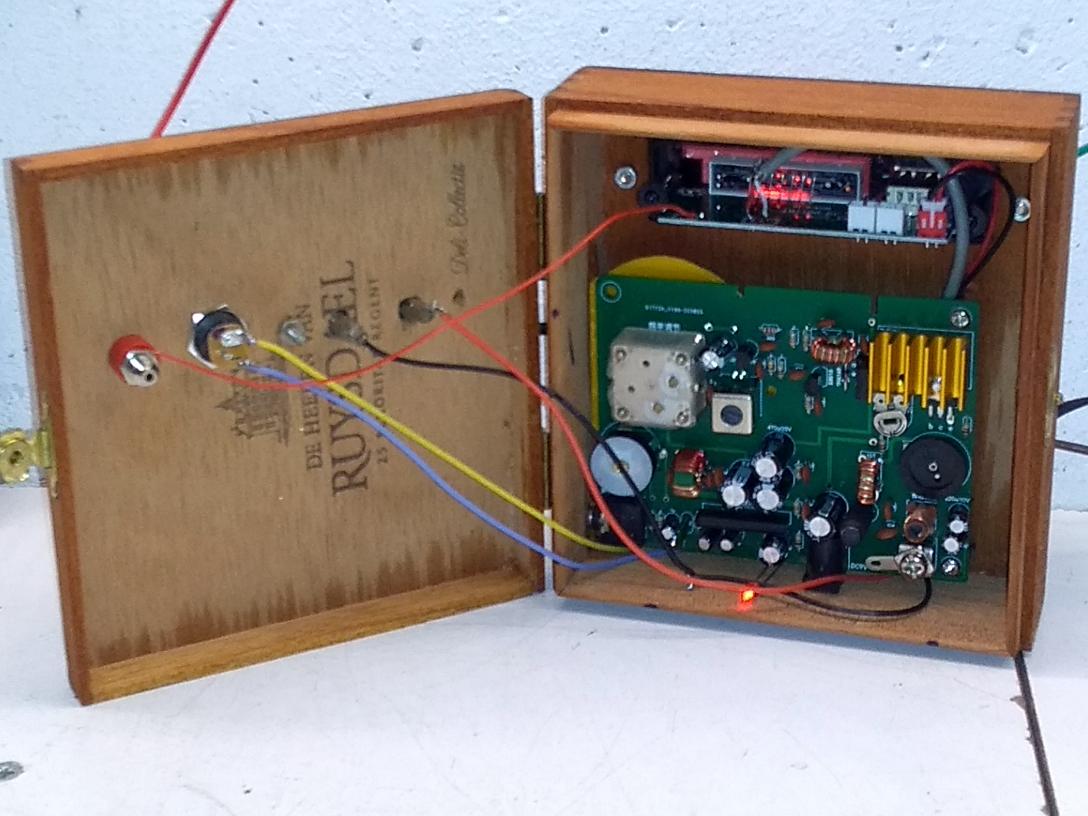 The AM mini transmitter is a construction kit obtained from AliExpress. From previous projects, I had some Bluetooth/FM/MP3 units left over, and I combined one with the transmitter in a wood cigar box. I used one that has output amplifiers on the board, but these are unused now.