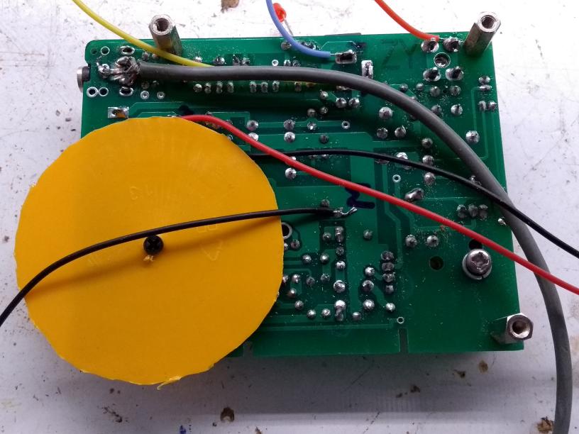 As can be seen from the scope image, the wave form is far from perfect, so the transmitter produces a lot of harmonics. The third harmonic is pretty strong in the Tropical bands, which is very handy for testing tropical radio's, and actually the transmitter sounds better there (by lack of disturbing signals). Even the fifth harmonic can be heard, in the shortwave bands. On the back are jacks for power (6V DC, plus is center), FM receiving antenna, and AM transmitter antenna and ground. With a ground, the transmitter works better.