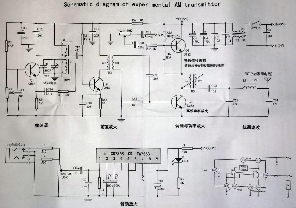Semi- conductors | 2x 9018 (osc), D882 (modulator), D882 (power), CD7368 (audio), LED. |