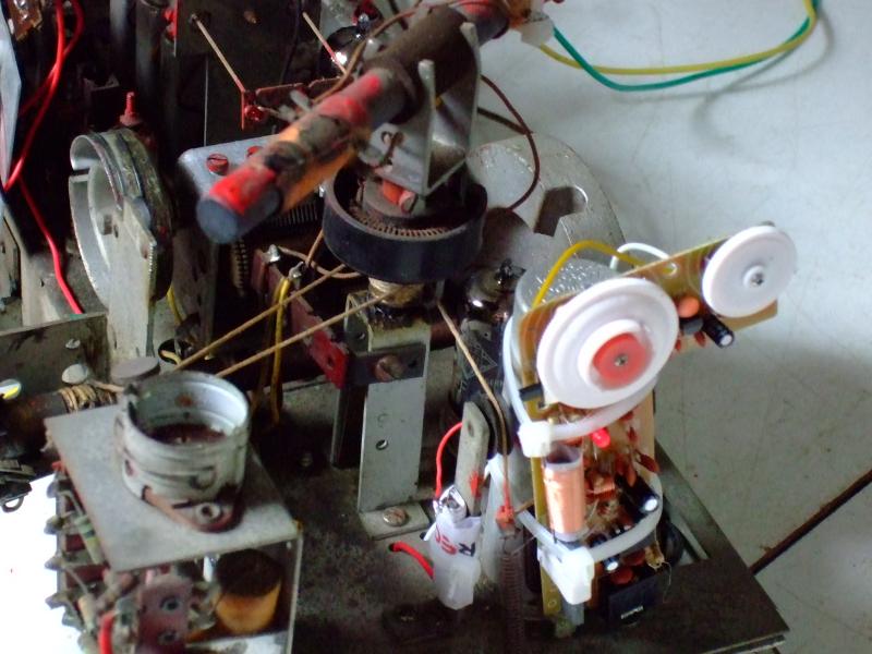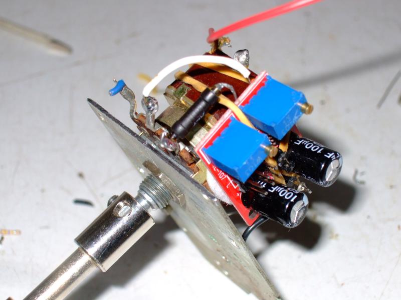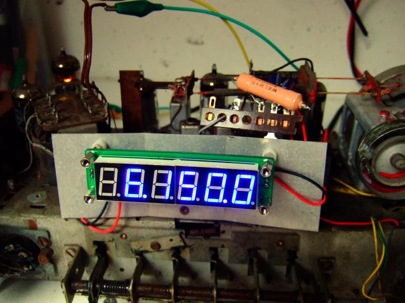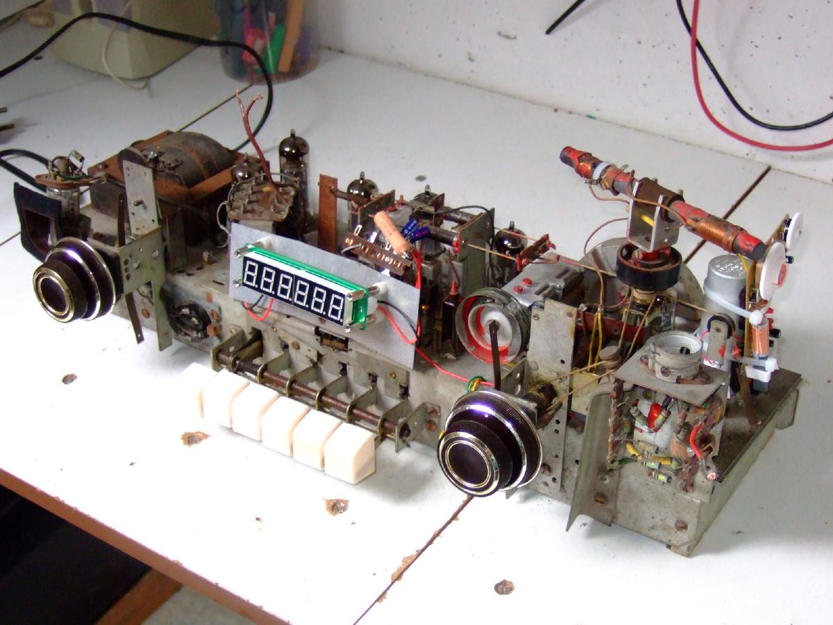 While testing the repaired set, the dial chord broke, so I smoothly entered phase 2 of the project. I removed almost everything that reminded of mechanical frequency indication, and reduced the dial drive strings to one, driving the variable capacitor from the tuning axis. I soldered a small DC supply from a diode and pi filter, and connected a frequency counter. The input of the counter goes to pin 7/9 of the ECH81, connected there through 22p capacity. The counter is programmed to display the measured frequency value minus 455kHz (because the oscillator frequency is always receiving frequency plus intermediate frequency).