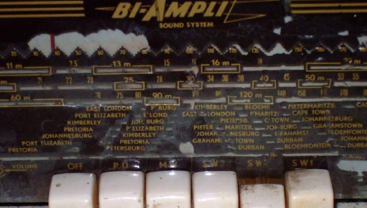 Witnesses by the names on the dial, this radio was intended for the African market. I have not been able to identify the type exactly, but found some useful information. The seller of the chassis informed me that it came from a large console including a pickup, which was confirmed by the presence of a pre-amplifier (EBC41). Comparing the chassis to various Dutch models, I expect the luxury class to be 6. The chassis looks like it was actually made in South Africa and date marks on the coils show they were made in 1956, so the model year of this chassis could be 1956 or 1957. This leads me to a guessed type number like FV665A.
