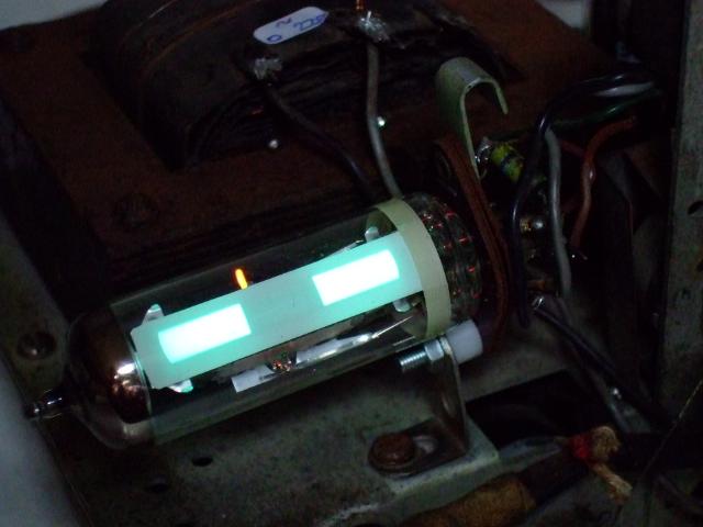 I was not very satisfied with the EM80 tuning eye, because it had lost all brightness, as most of these tubes have. My junkbox had nine pieces of EM84, so I rewired the socket and inserted an EM84. This gave quite visible tuning indication.