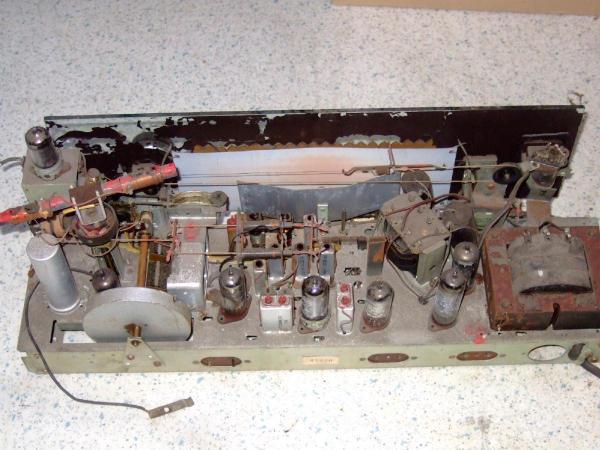 The repair of the radio chassis was not difficult. I replaced all tar capacitors (all being very leaky and way out of capacity) and the cathode elco for the EL84. I measured the tubes and found the EF42 to be dead (interrupted heater) so I put an EF41 from my stock. Then the radio produced some sounds, I measured voltages and found the mixer screen voltage to low, replaced a resistor, and everything worked. Unfortunately, on MW there isn't much to listen in anymore, but the Tropical Band on this set starts from 1600kHz, and I could hear some nice Dutch pirates there.
