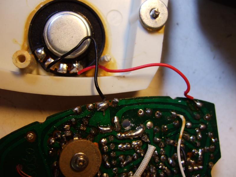 The battery compartment was broken, but this was later repaired.  In 2015 the left speaker stopped working.  I didn't take the royal way here of repairing the tiny amplifier, but instead soldered the right speaker (red wire) to the output of the left one (white wire).