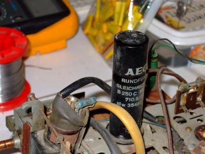 No DC on the filter caps... this looked bad for the rectifier, an old selenium piece.  With some work I took it out, and replaced the inside by a modern silicium B400C1500 (1 euro) and put it all back together again.