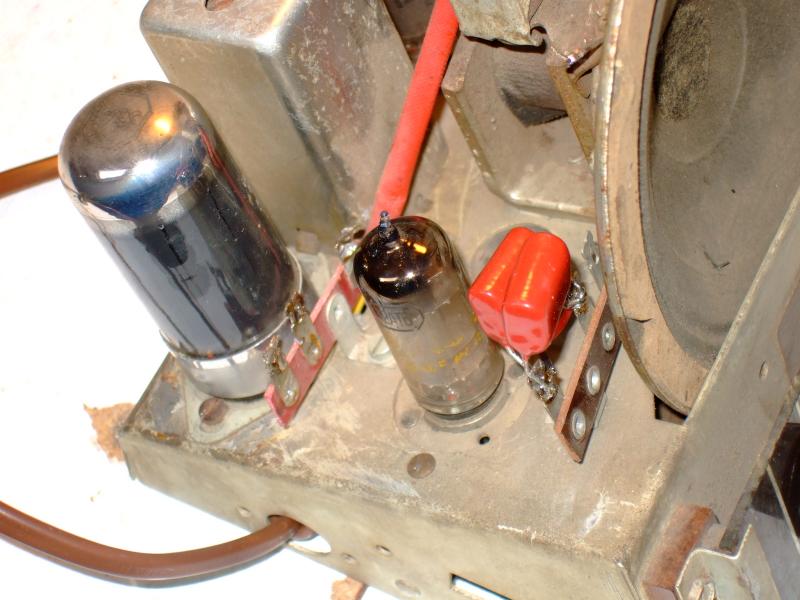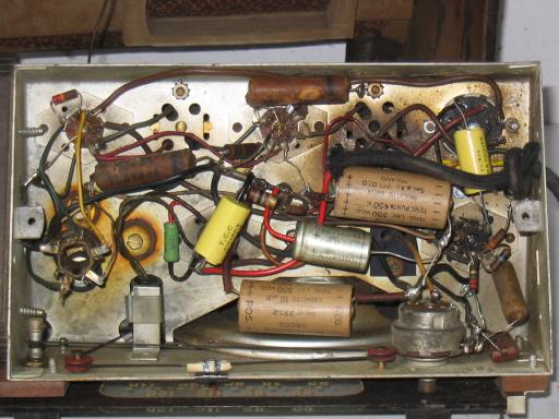 The inside picture (left) shows how the tiny chassis with the loop antenna on it, just barely fits in the wood case. I didn't trust the replaced filter caps (Italian jobs with paper coating, photo right) and replaced another five capacitors.