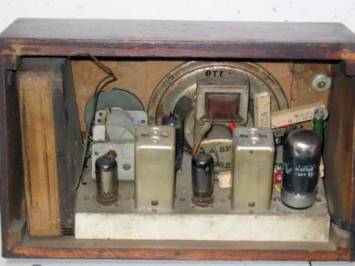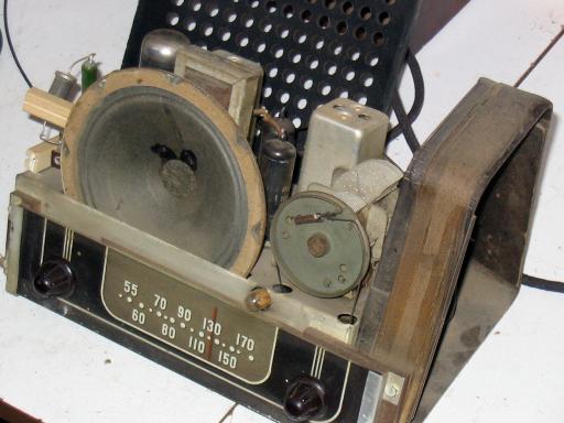 Yet, the reception performance of these simplest American radios is often very good. A few differences with European radios jump to mind. American radios often have the loudspeaker mounted on the chassis (while European radios have them fixed inside the cabinet), which makes it very convenient to pull the chassis. And loop antennas are very common; I've seen them on almost all my American radios, including this RCA Victor from about the same era. In European radios one would more likely find a ferrite rod. Most loop antennas are parallel to the radio's back, but this one is perpendicular to the back. Remember, to receive a station, the plane of the loop should point to the transmitter. So with most radios with loop aerials, you receive the stations left and right of the radio, but with this one you receive the stations in front of and behind the radio. This would also be common with a ferrite rod, placed in the length of the radio.