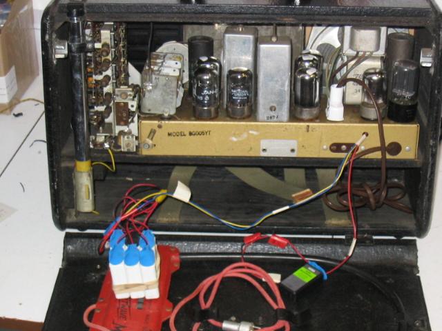 After tube replacement, the radio works well (as you can hear). It plays on either 110V mains (AC or DC) and on batteries. I use one 9V rechargeable for the filaments (draw is 50mA), and six of these combined to 54V for the plate (draw is 5 to 7mA).