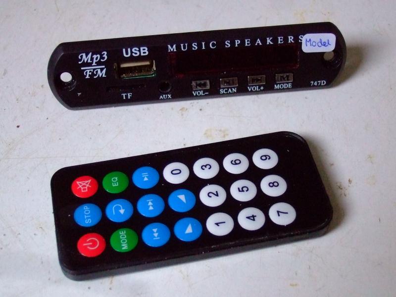 the 747D FM, USB, SD music player, operating from 5V DC and including remote control. The idea was to construct a remote controlled stereo set by building this unit in old speaker units, together with an amplifier from PC speakers.