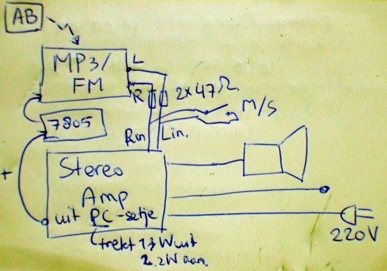 In the side of the master speaker I sawed an opening and mounted the 747D unit. I added an L7805 voltage stabilizer to supply 5V to the unit, from the buffer elco of the amplifier. My idead for the final unit was that it could be used in Mono mode (just the Master) or Stereo (with the slave also connected). This worked more or less OK, I immediately got sound from the speakers and I could use the remote control, and play radio and MP3 files as well. Problem was that the pulsed current drain from the FM/MP3 unit caused a heavy noise in the amplifier! That this was really power induced I could verify by turning the amplifier volume control to zero: a nasty humming beep sound could still be heard.
