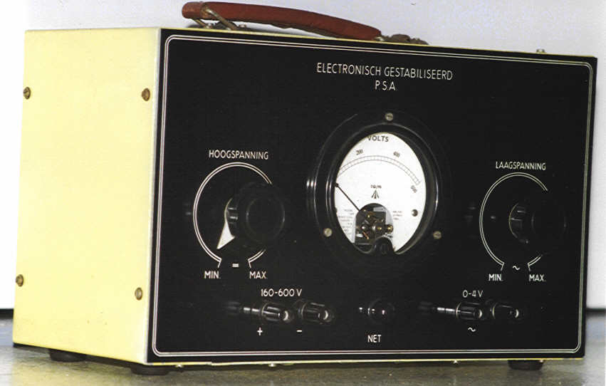 I think this was made and used in a small laboratory or repair shop. The unit gives a regulated voltage ranging from about 180 to 580 Volts and AC (Heater) supplies of 6.3, 12.6, and 20V.