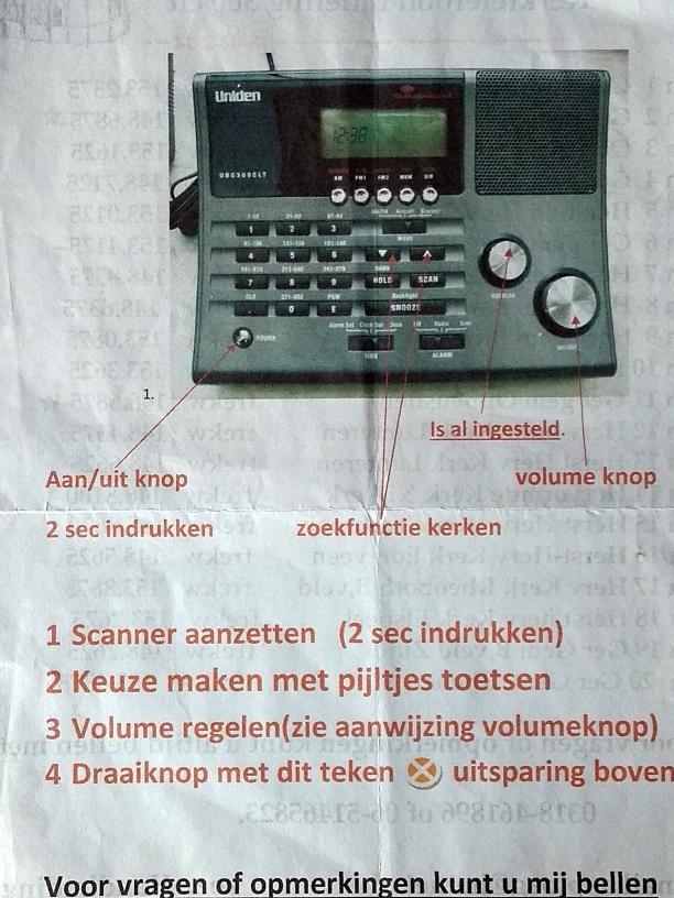Some churches use VHF broadcasts to allow attending services by air, but operating a general scanner is complicated. Church volunteers helped out by pre-programming the scanners and supplying a simplified manual. Around 1999, an engineer, let us call him A, living in The Veluwe incidentally overheard a church broadcast when operating a VHF scanner. After helping out a friend to receive the church service, A's assistance was asked frequently and he started a small scanner side business. He bought Uniden scanners, programmed the church frequencies, wrote a simplified user manual, and sold the units. The older units were of type 244clt, these had the disadvantage theat on power on, they would always start in scan mode. The later model 360 would start in the mode in which it is switched off, which makes it even simpler to operate. An additional advantage of the next model, 370clt, was that they can be programmed automatically by connecting to a PC.